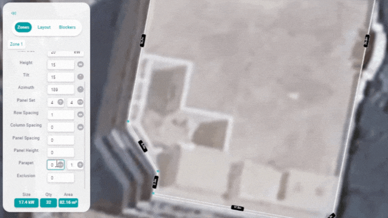 Parapet Width: Use the Parapet Width tool to define the width of parapet elements in your solar array layout.