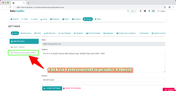 Step 1: Click on the Settings Step 2: GO to HOME Step 3: GO to Preferences (Proposals & Others) Step 4: Scroll down, Go to "Your Payment Details" and Update the details in the box Step 5: Click on "Update Preferences" to save the data.